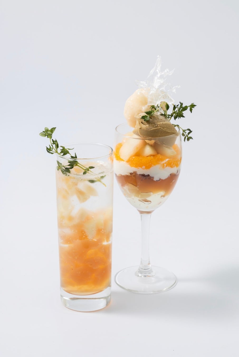 白桃と紅茶の風味が香る夏のパフェとドリンク。夏にぴったりの爽やかな味わいに仕上げました。