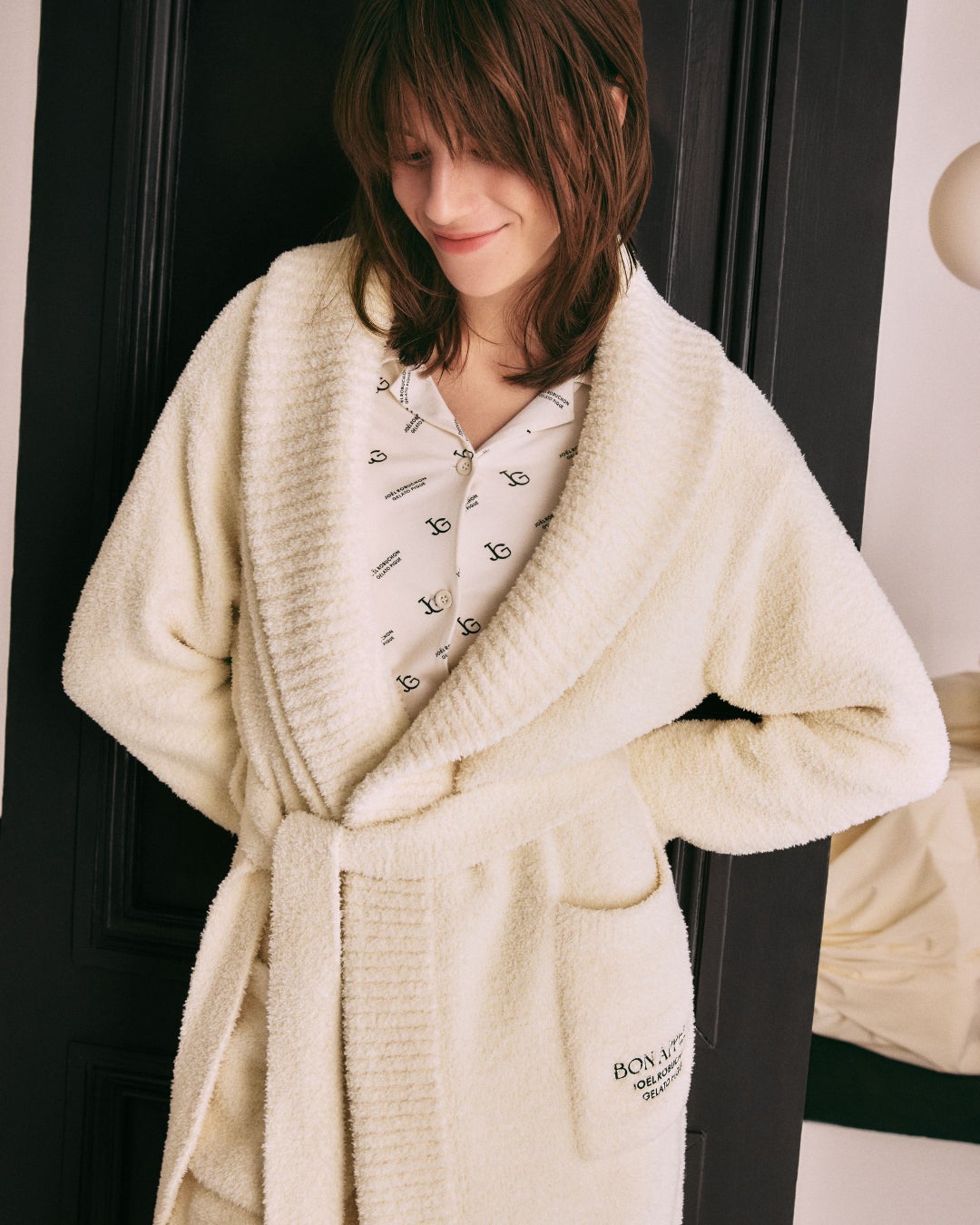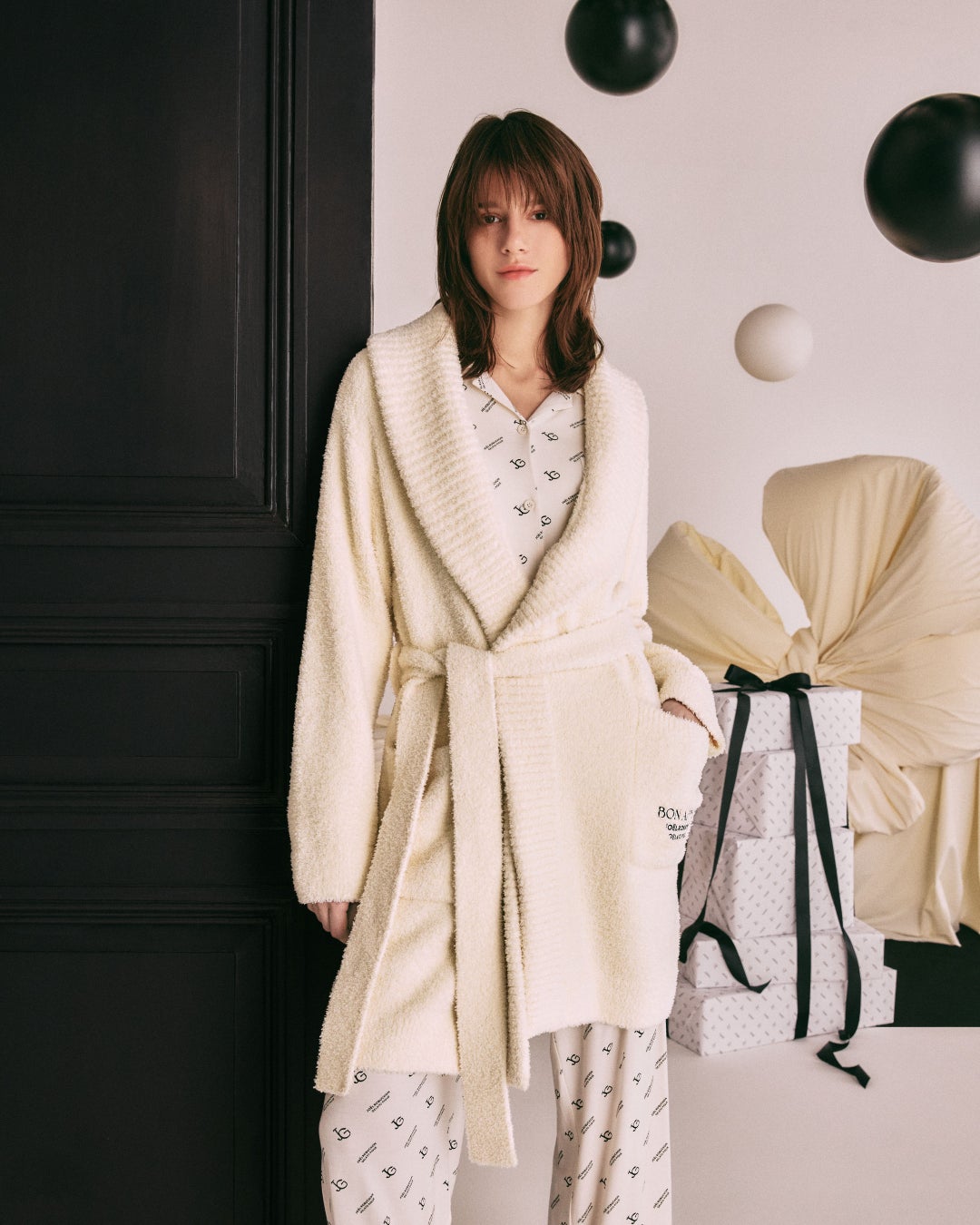 おうちでのリラックスしたひとときにぴったりなスタイリッシュなニットガウン。首元までふっくらと包むボリュームのある襟がコーディネートを彩ります。レディースサイズは、ジョエル・ロブションのスペシャリテである“じゃがいものピュレ”をイメージしたクリーム色でご用意しました。