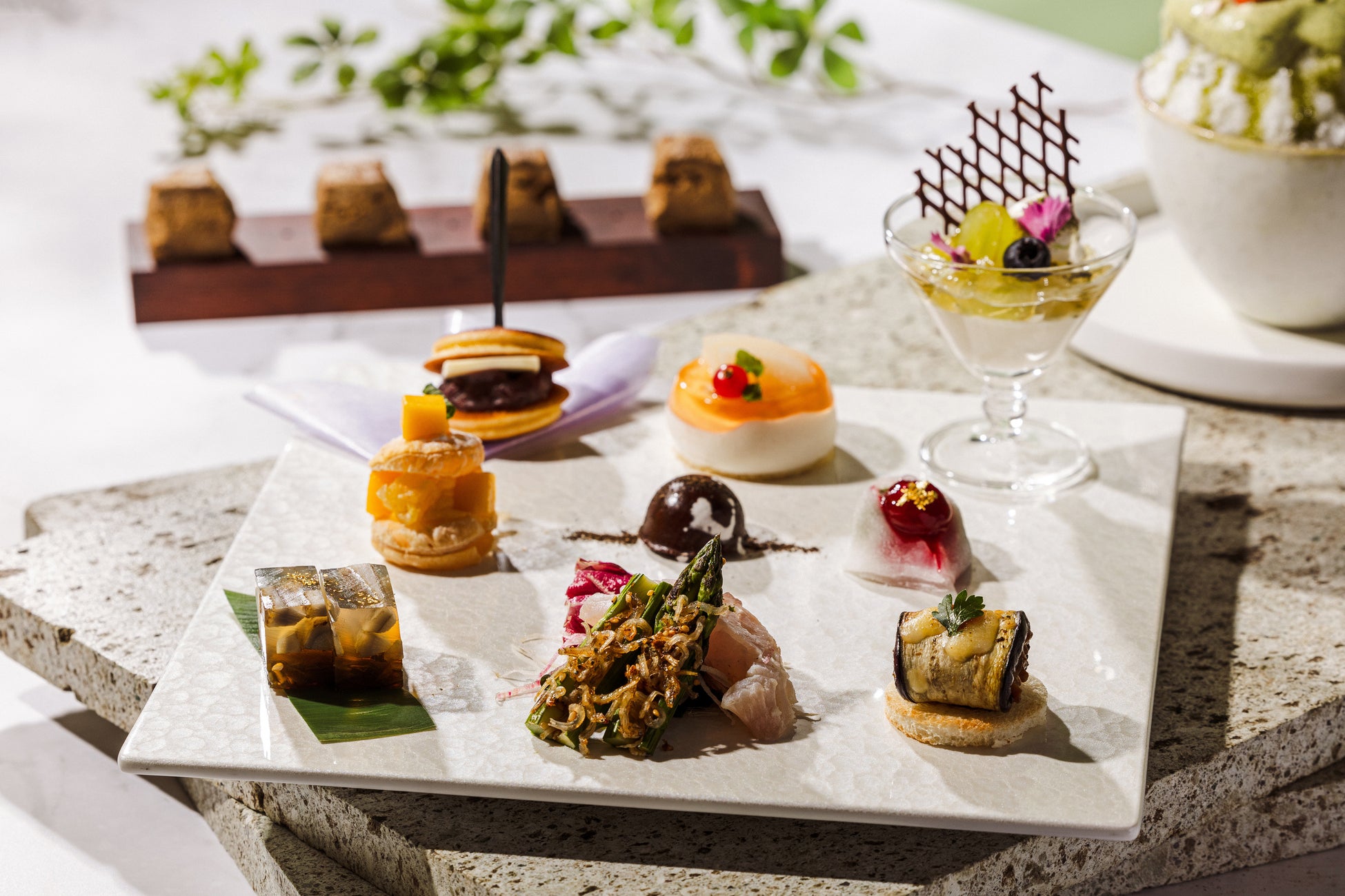 300 年以上の歴史を持つ「一保堂茶舖」の日本茶の豊かな香りと旨みを五感で味わうアフタヌーンティーをご用意しました。スイーツとセイボリーには和の素材を巧みに取り入れ、夏にふさわしい清涼感と奥行きのある味わいを演出しています。
