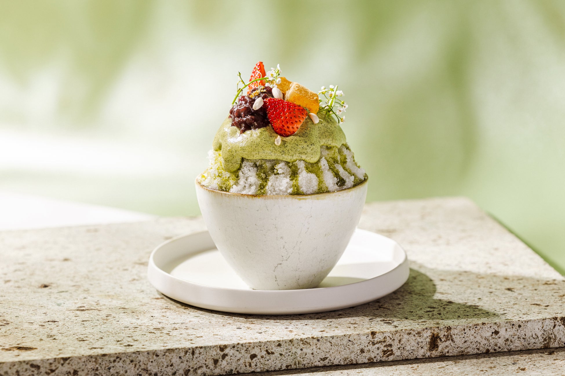 名水の地・八ヶ岳南麓で製造される、天然氷「蔵元八義」の氷を使用。繊細でふわふわとした口どけの氷に、玉露の深い旨みを生かした特製玉露クリームと、上品な甘さの粒あずきやわらび餅を重ねました。
