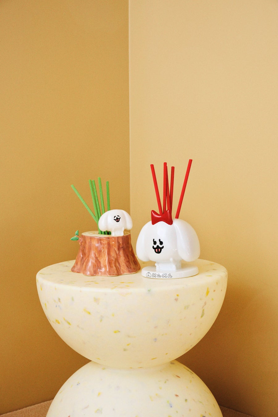 今回のコラボレーションでは、パントビスコ氏の生み出す多彩な人気キャラクターたちの中から、犬の「ぺろち」を中心とした「ヘチタケシリーズ」の仲間たちが登場。イラストから飛び出してきたような立体感のある陶器のディフューザーや、ふわふわとした質感のフェイス型クッションなどのインテリアアイテムをはじめ、カバンの中やデスクの上でほっと和ませてくれる、ポーチやステーショナリー、ぬいぐるみキーホルダーなどをラインアップ。