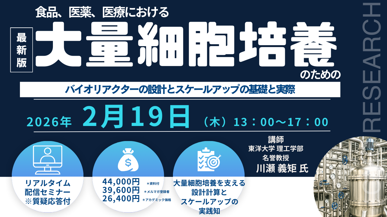【ライブ配信/ZOOM】「食品、医薬、医療における大量細胞培養のためのバイオリアクターの設計とスケールアップの基礎と実際」セミナー開催!2026年2月19日(木)主催:(株)シーエムシー・リサーチ