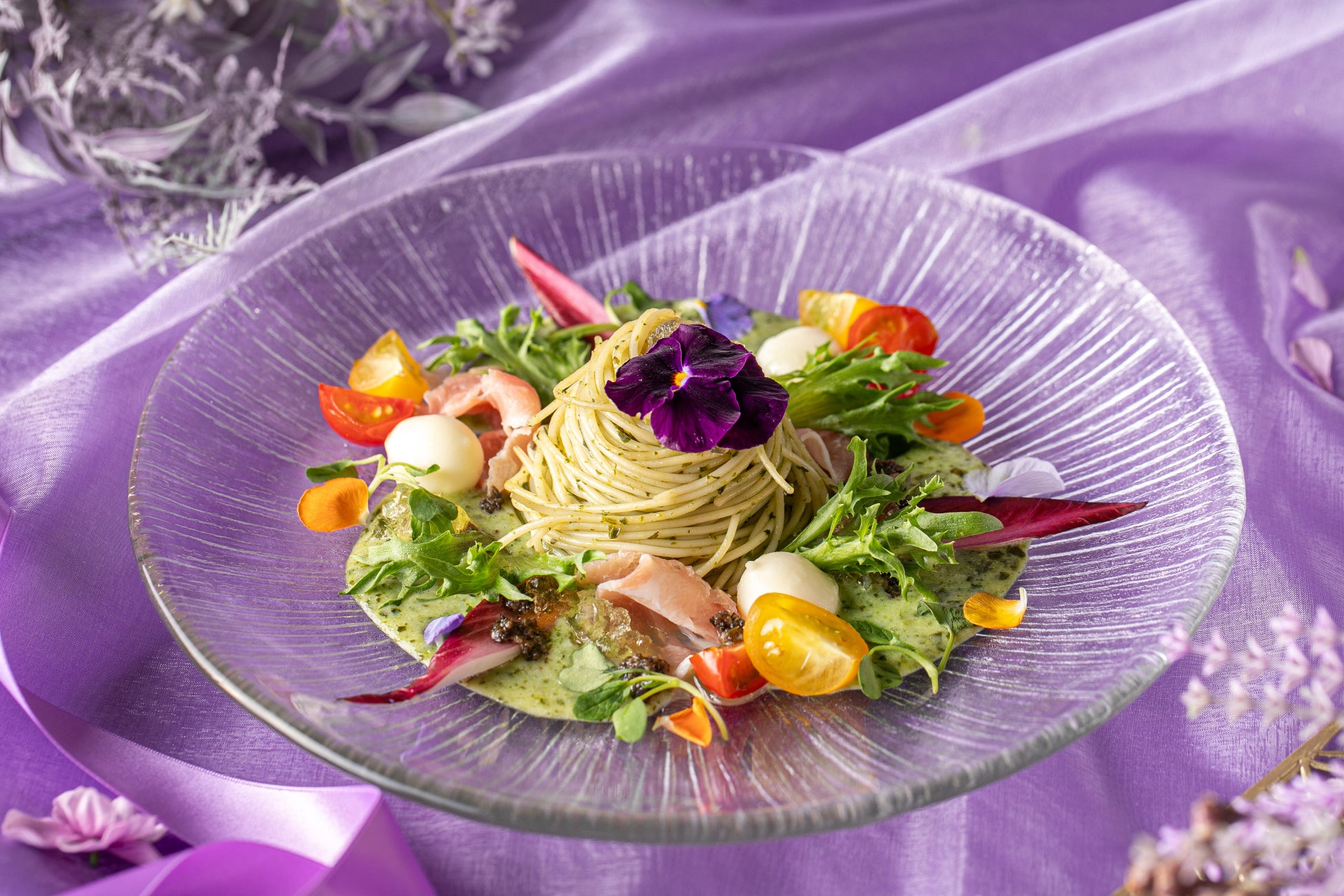 食欲が落ちてしまう夏だからこそ、さっぱりとお召しあがりいただきたいという想いから、メインに「冷製ジェノベーゼパスタ」など、セイボリーも充実したラインナップに仕上げました。ウェルカムドリンクには、淡いラベンダーカラーが涼しげな夏を連想させる「ブルームフィズ」が登場。