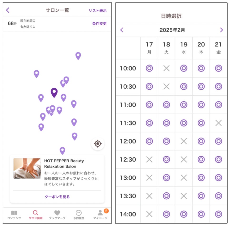 『ホットペッパービューティー』は、年間予約件数1億8388万件※1の国内最大級のヘアサロン・リラク&ビューティーサロンの検索・予約サービスです。多様な切り口の特集、行きたい日時での検索、ヘア・ネイルカタログ、口コミ、お得なクーポン、サロンスタッフなどから、自分の行きたいサロンを検索できます。ウェブサイト・アプリから24時間いつでも・どこでも予約でき、予約後に来店するとポイントが2%たまり、次回の利用時などに使えます。ジャンルは、ヘア、リラクゼーション、エステ、ネイル、アイビューティーまで幅広く提供しています。30分ごとの空き状況が確認できるため自分の予定に合わせた予約ができ、エリア検索機能で通いやすいサロンを見つけることができます。