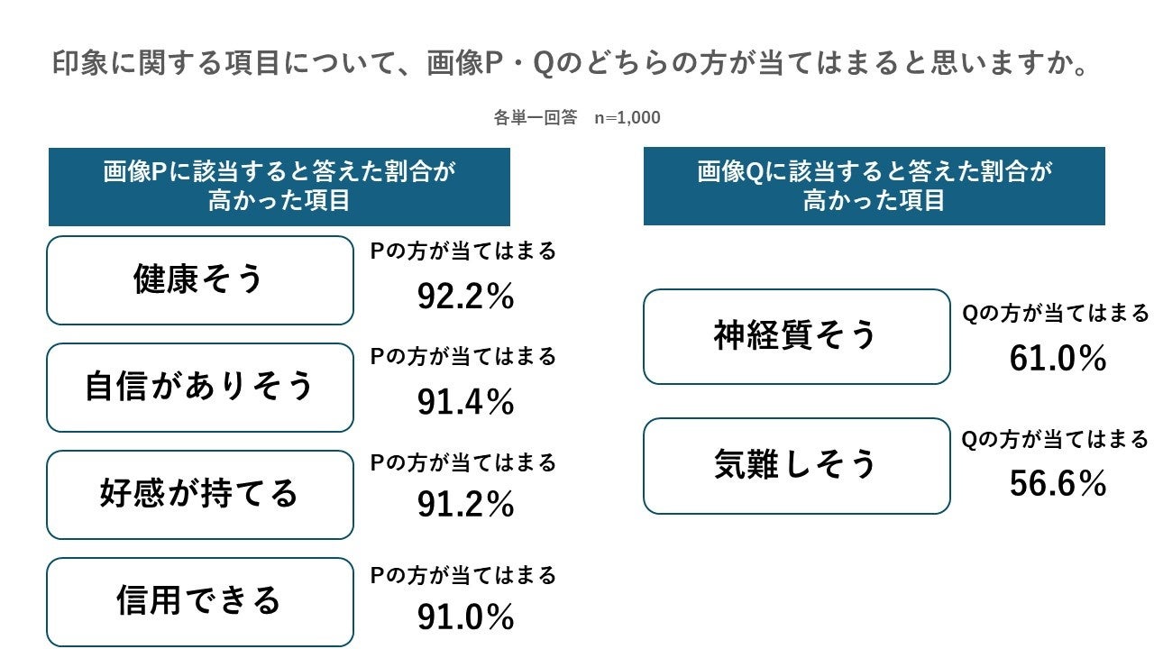 また、印象に関する項目について画像Pと画像Qのどちらの方が当てはまるか聞いたところ、画像Pが90%を超えた項目は「健康そう」「自信がありそう」「好感が持てる」「信用できる」の4項目となっており、比較した時にポジティブな印象を持たれやすいことが明らかになりました。一方で、画像Qが画像Pより高い割合となった項目は「神経質そう」「気難しそう」の2項目になりました。猫背の人はネガティブな印象を持たれやすいことが明らかになり、猫背か否かだけでも印象が大きく変わることが分かりました。
