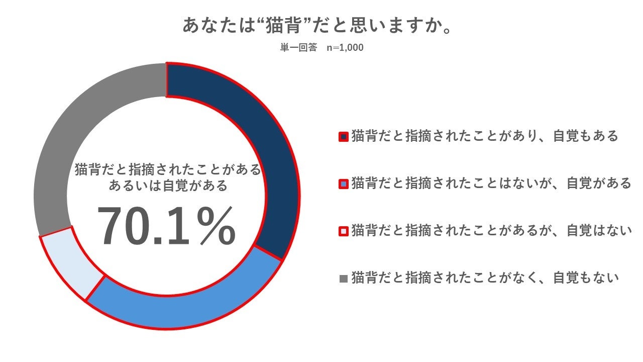 ■70.1%が猫背だと指摘されたことがある、あるいは自覚があると回答。