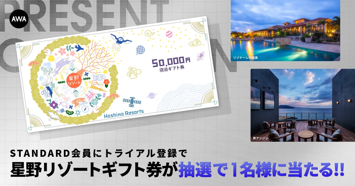 AWA株式会社(本社:東京都港区、代表取締役CEO:冨樫晃己)が運営する、サブスクリプション型(定額制)音楽ストリーミングサービス「AWA(アワ)」は、2024年11月27日(水)より、AWA STANDARD会員へのトライアル登録者を対象に、星野リゾート宿泊ギフト券 5万円分が抽選で1名様に当たるプレゼントキャンペーンを開催いたします。