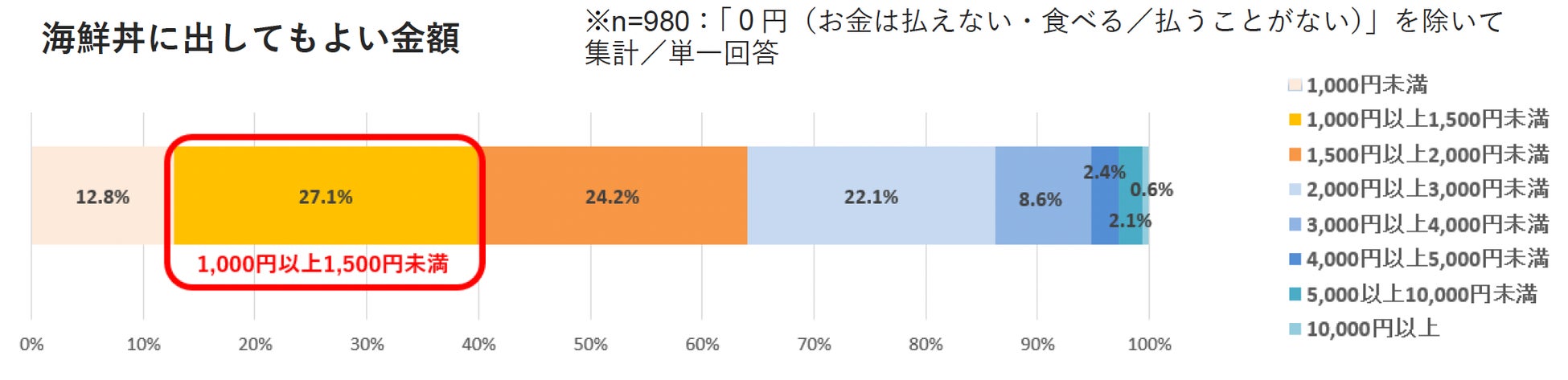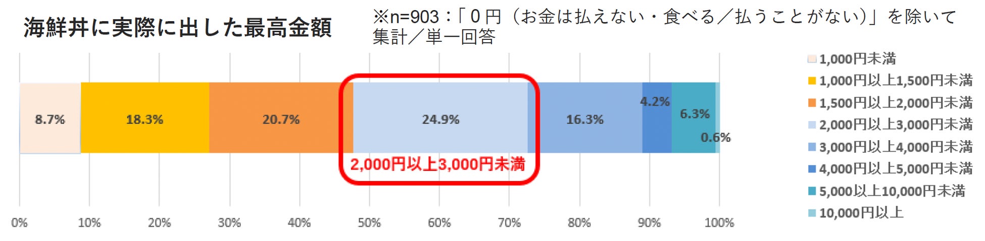 「海鮮丼」にかける予算を「実際に出した最高金額」と「出してもよい金額」についてそれぞれ聞いたところ、「実際に出した最高金額」で最も割合の高い価格帯は「2,000円以上3,000円未満」で24.9%でした。一方「出してもよい金額」では、「1,000円以上1,500円未満」が27.1%と最も高くなりました。「実際に出した最高金額」のほうが「出してもよい金額」より高い結果となりました。