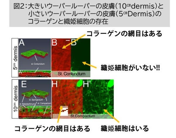 一方、ウーパールーパーは非常に透明度の高い動物で、小さな個体では骨まで見ることができます。この特性を生かし、ウーパールーパーの皮膚を使ってコラーゲンの生成過程を研究したところ、これまで常識だと考えられてきた線維芽細胞と呼ばれる細胞群ではなく、表皮細胞(ケラチノサイト)が主要なコラーゲンの供給源であることがわかりました。