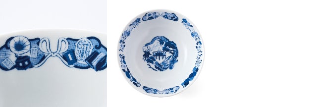 どんぶりのデザインは3種類です。器の外側には、著作から着想したデザインがほどこされています。器の内側は、乱歩がかつて就いた職や、彼の功績にちなんだモチーフで彩られています。また、器の底面には江戸川乱歩が一時期使用した変名「小松龍之介」にちなみ、龍と松の意匠を入れています。