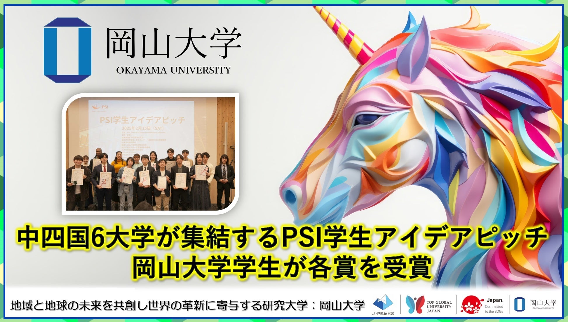 国立大学法人岡山大学(本部:岡山市北区、学長:那須保友)は、中四国地域の各大学の学生が自らのビジネスアイデアを発表する「PSI学生アイデアピッチ」を2025年2月15日に本学津島キャンパスの共創コモンズ(OUX)で開催。本学が参画する中四国スタートアップ・エコシステムPeace & Science Innovation Ecosystem(PSI)により実施されました。