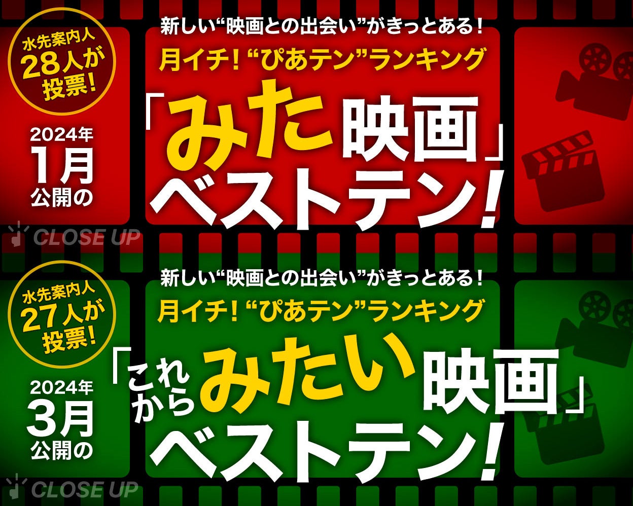「ぴあ」(アプリ&WEB)の“水先案内人”(=レビュアー)合計28名に2024年1月公開の「みた」映画の中からそれぞれがベスト3までを挙げていただき、1位:5点、2位:3点、3位:2点のポイントを付けたうえで集計したもの。対象は2024年1月1日~1月31日に日本で劇場公開された作品で、映画祭や特集上映での公開作、配信のみの作品、ブルーレイ・DVDのみでの発売作品は含みません。