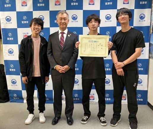 2024年10月6日に行われた『スポGOMI甲子園2024・京都府大会』で優勝した福知山成美高等学校(京都府福知山市、兒島 裕之校長)、福知山高等学校(京都府福知山市、藤田浩校長)、大江高等学校(京都府福知山市、溝口睦久校長)の混合チーム3人組の「暇人」が、大会での成果を報告するため宮津市の城﨑市長を表敬訪問しました。