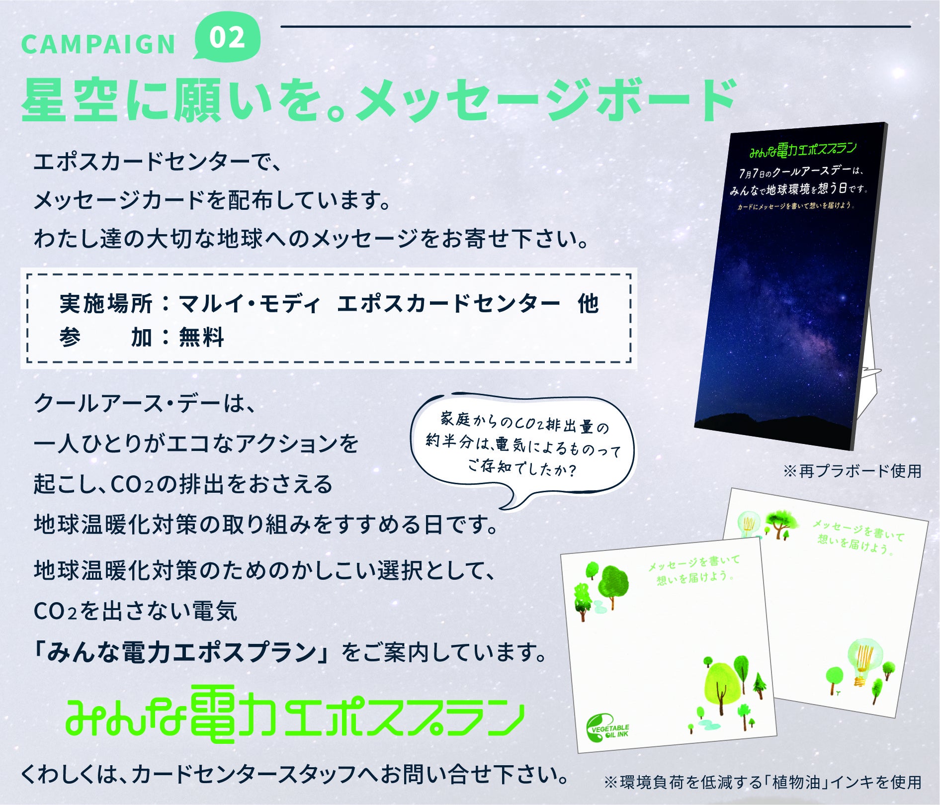 「マルイ・モディ ライトダウン」と同期間で、「星に願いを。キャンペーン」を開催いたします。同キャンペーンでは、各店にご用意した七夕ボードに”お客さまから地球へのメッセージ”をお寄せいただくとともに、”再生可能エネルギー”を取り扱うみんな電力の取り組みをご紹介いたします。取り組みにご賛同いただける方には、再エネ電力へ簡単に切り替えができる「みんな電力エポスプラン※」のご案内もいたします。