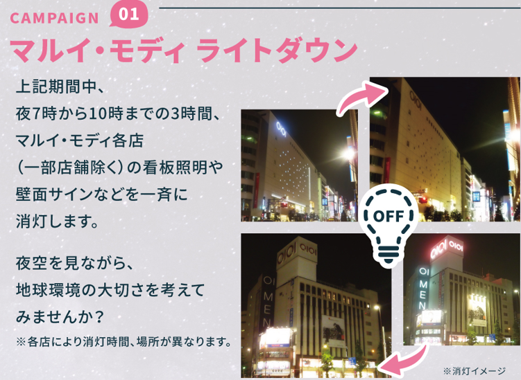 「マルイ・モディ ライトダウン」は、企業としてCO₂削減のアクション、ならびに、電力ひっ迫危機などを考慮した省エネ対策の一環として実施。6月24日(金)から7月7日(木)のクールアース・デー※までの14日間、19時から22時の間、マルイ・モディ各店(一部店舗除く)の看板や外壁など屋外照明の一部を消灯いたします。お客さまには夜空を見ながら、地球環境の大切さを考える機会としていただけることを願い実施いたします。