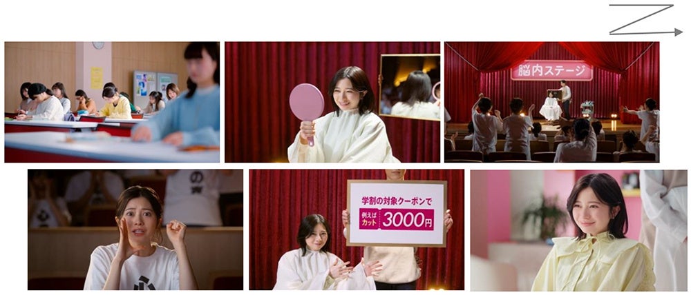 「自分でゴキゲン篇」は、テストがやっと終わった桜田さんが学割クーポンを使って美容室を予約。シーンが切り替わるとそこは脳内ステージ!舞台上には美容室でカットした桜田さんがいますが、観客席にも桜田さん!「髪の毛さらさらすぎかよ!」「シルク100%か!」「まとまり良過ぎ!花束か?!」と、あらゆる褒め言葉を叫んで観客席から応援します。すると、舞台上の桜田さんに美容師さんから学割クーポンの情報をすっと差し出され、思わずそのお得さに加えてかわいくなれた自分にも嬉しくなってるんるんで帰る、という内容になっています。