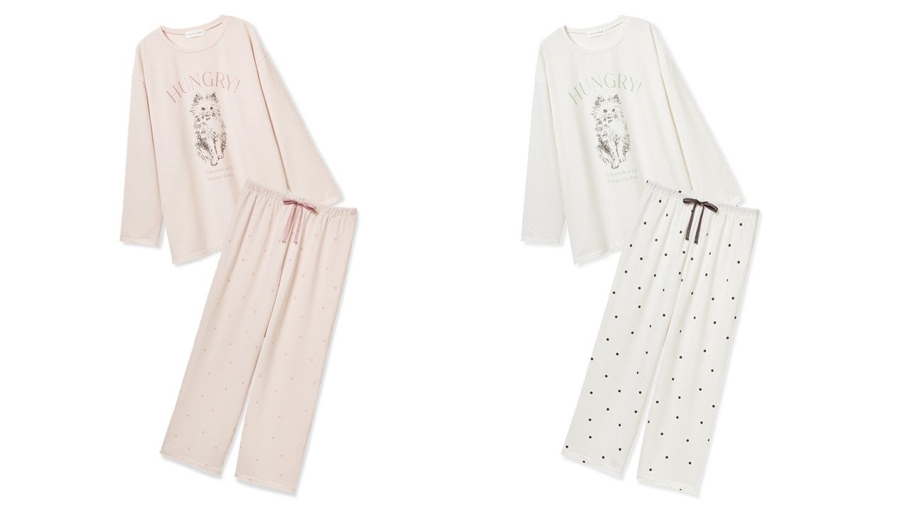 キャッチーな猫のデザインがポイントのカットソーセットアップ。トップスはふわっとした毛並みが愛くるしい猫のイラストをプリント。パンツはドット柄でポップに仕上げました。