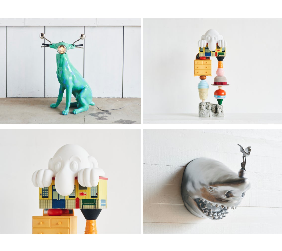 廃材や樹脂、電動器具などを組み合わせ創りだす独自の世界観で、作品制作にとどまらず家具やプロダクト、空間演出ディレクション・制作まで幅広く手がける。どこか懐かしさを覚えるアナログ感とクレイジーな色彩が融合した作品群は、国内外から注目を集めている。