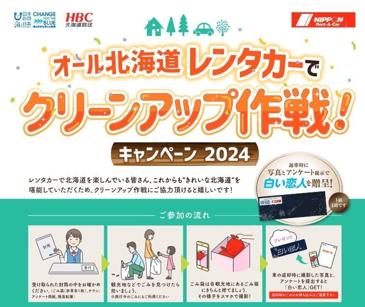 キャンペーンの流れ | 1.レンタカーを借りる際に封筒を受け取る (ごみ袋2枚、チラシ、アンケート、簡易鉛筆) 2.観光中にごみを拾う(その様子を写真で撮影) 3.返却時に受付で写真を見せてアンケートを提出 「白い恋人」を一組にひと箱プレゼント! |