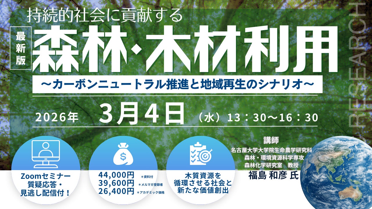 【ライブ配信/Zoom】「持続的社会に貢献する森林・木材利用 ~カーボンニュートラル推進と地域再生のシナリオ~」セミナー開催!3月4日(水)主催:(株)シーエムシー・リサーチ
