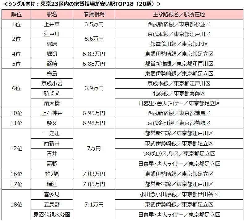 18位までにランクインした20駅の立地を見ると足立区が9駅、江戸川区が5駅、葛飾区が2駅。その他は杉並区、北区、練馬区、世田谷区が各1駅という顔ぶれでした。一番多くランクインした足立区の駅の中で家賃相場が最も安い駅は、4位・堀切駅で6万8300円でした。