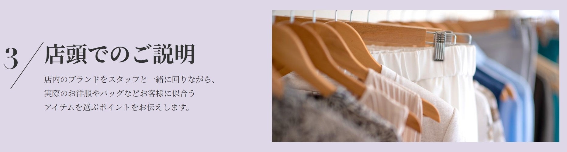ファッションナビスタッフが店内のお買い物にご同行して、診断結果に基づいてお客様のご要望やご着用シーンに合わせたコーディネートのご提案をいたします。