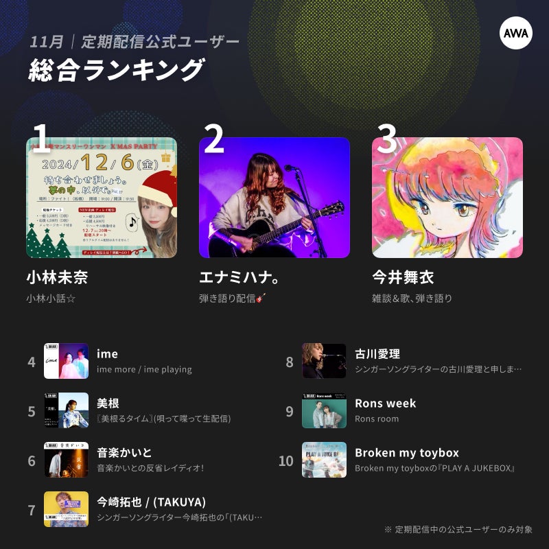 AWA株式会社(本社:東京都港区、代表取締役CEO:冨樫晃己)が運営する、サブスクリプション型(定額制)音楽ストリーミングサービス「AWA(アワ)」は、2024年11月1日(金)から11月30日(土)までに開催された、音声ライブ配信を利用した「定期配信ラウンジ」※の視聴数、開催頻度、リアクション数、フラワーチャット本数などを総合して、2024年11月の定期配信AWAラウンジランキングTOP10を発表いたしました。