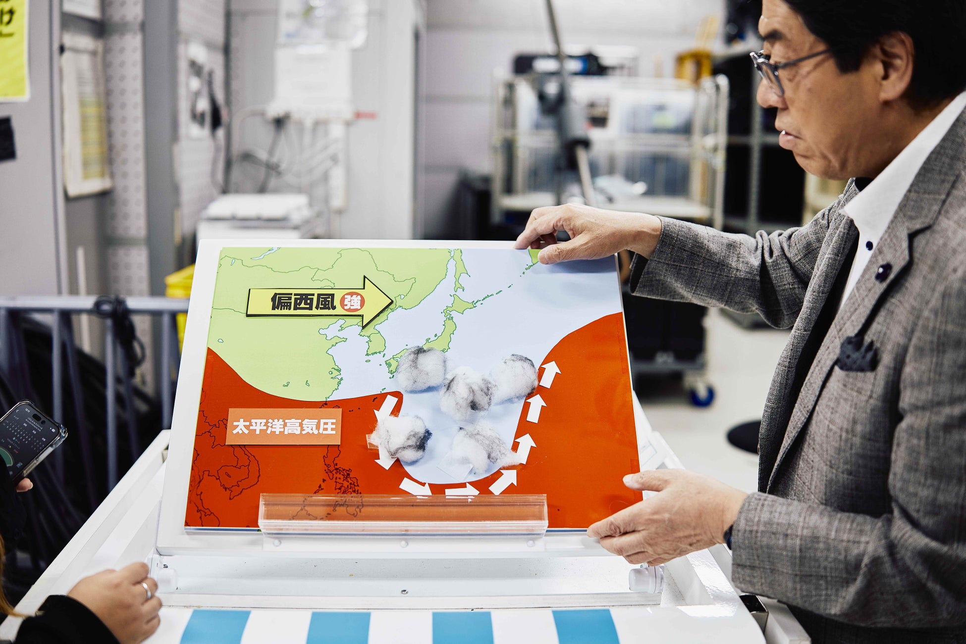 分かりやすく解説するために、テレビ番組ではさまざまな小道具も準備している。この日は出番を待つ間、雲の動きを説明するパネルを入念にチェックしていた。