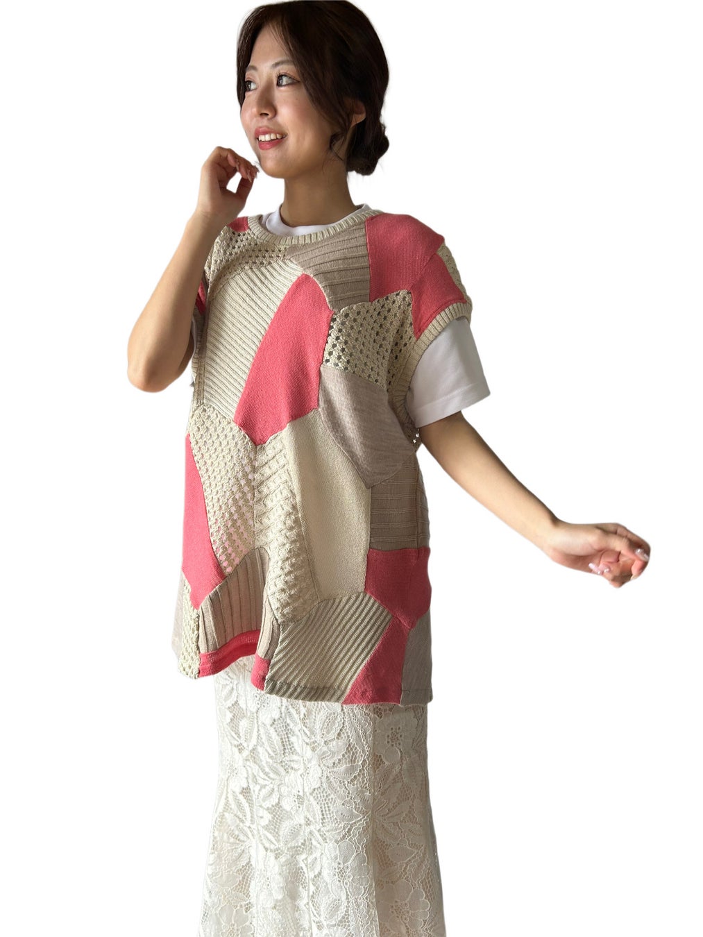 色彩豊かな高級ニットパーツの組み合わせで作ったAMISONJIブランドを代表するベストです。