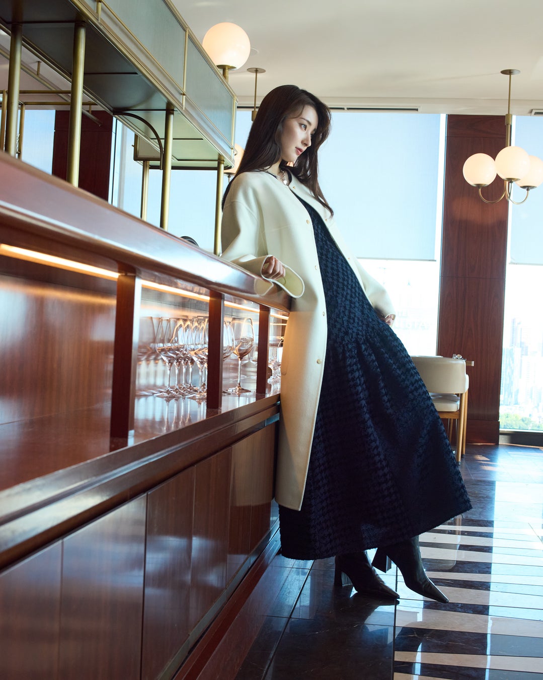 千鳥格子柄とネイビーカラーの組み合わせが上品なカシュクールドレス。さらに最高級ウールを使用したノーカラーコートを携えて、クラス感をアップ。