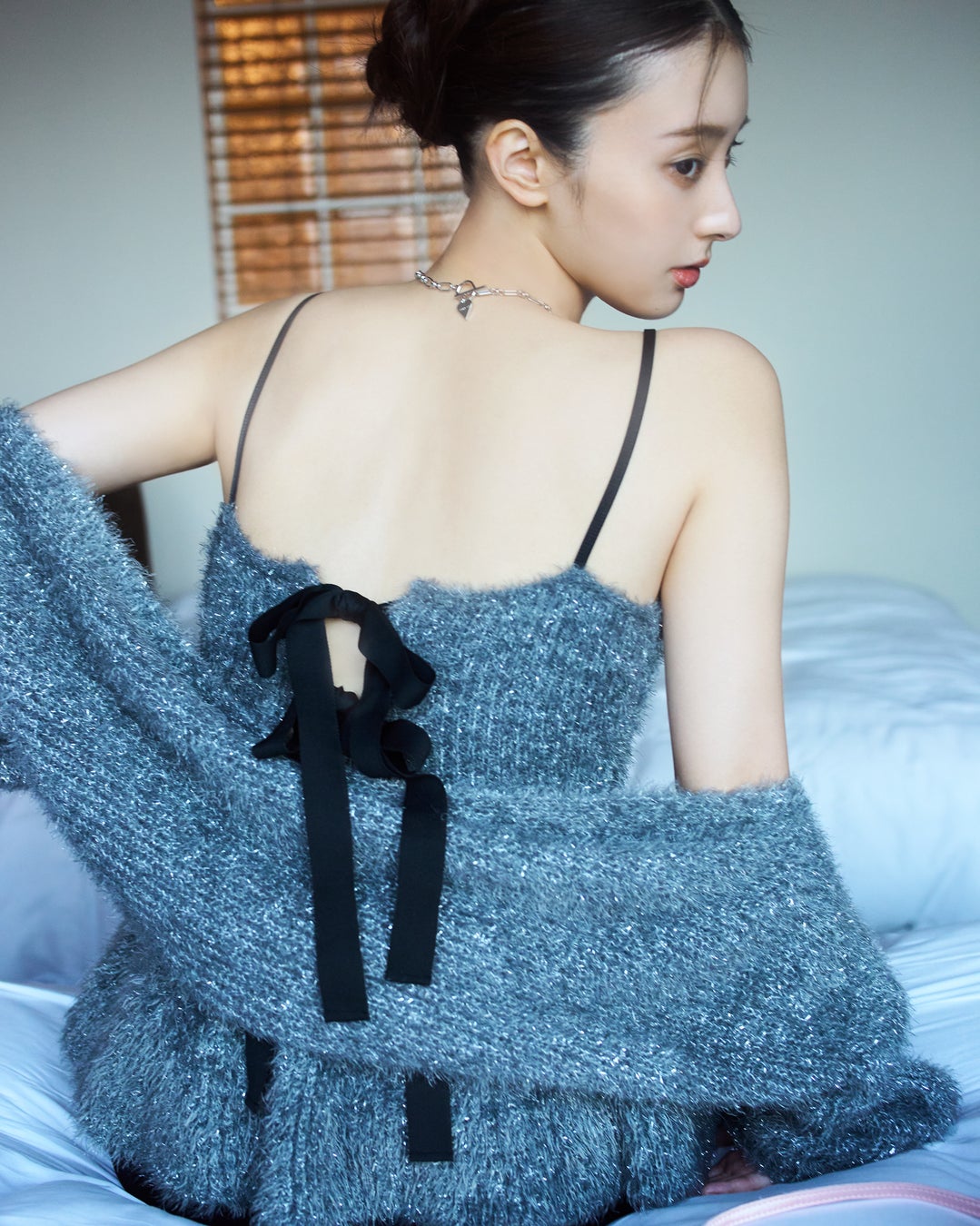 カーディガンとドレスがセットになる一枚。カーディガンはゆったり着れるショート丈で、ニットワンピースは後ろにスリットが入ったロング丈のキャミソール型。肩紐で着丈を調整することができ、着心地の良いドレス。