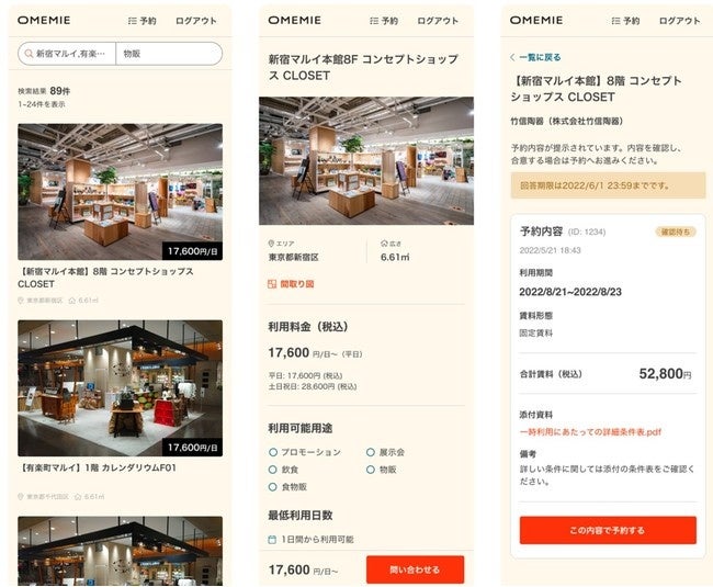 「OMEMIE」とは、マルイ店舗への出店の検討から問い合わせ、契約までの手続きがオンラインで行える出店サービスです。マルイ店舗の約150区画をサイトに掲載し、ポップアップイベント(短期出店)でのお申込みを中心にスタートいたしました。また、2022年7月からは長期の出店まで選択可能となり、より多くのお取引先さまのリアル店舗出店をサポートしてまいります。