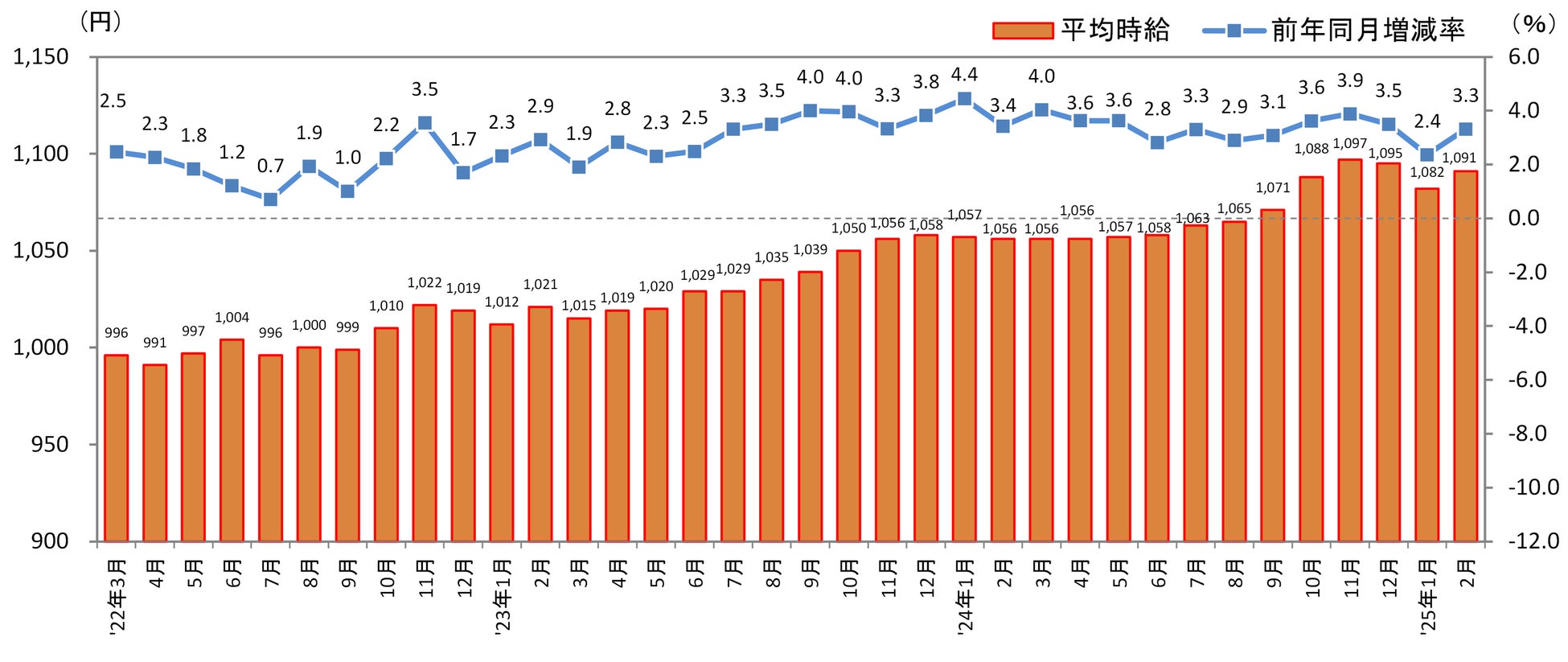 福岡県の2月度平均時給は前年同月より35円増加の1,091円