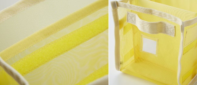 何を入れたのか一目瞭然の全面メッシュの収納ボックスです。「見えなくなったら中身を忘れてしまう」という声から生まれたアイテムです。位置調整できる仕切り付きで、内容や名前をカードに書き込めば家族で使い分けもできます。持ち運びしやすい持ち手も付いています。