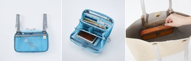 財布やカギ、スマホなど、大切なもののバッグの中での迷子を防ぐメッシュ素材のバッグインウォレットです。大きな金具でファスナーを引くと、がばっと開いて中が見やすいじゃばら型になっています。デザインは〈ライトブルー〉〈ライトグリーン〉〈ライトオレンジ〉の3種類です。ふだんから大切なものをまとめて入れておけば、バッグを変えても忘れ物を防ぐことができます。