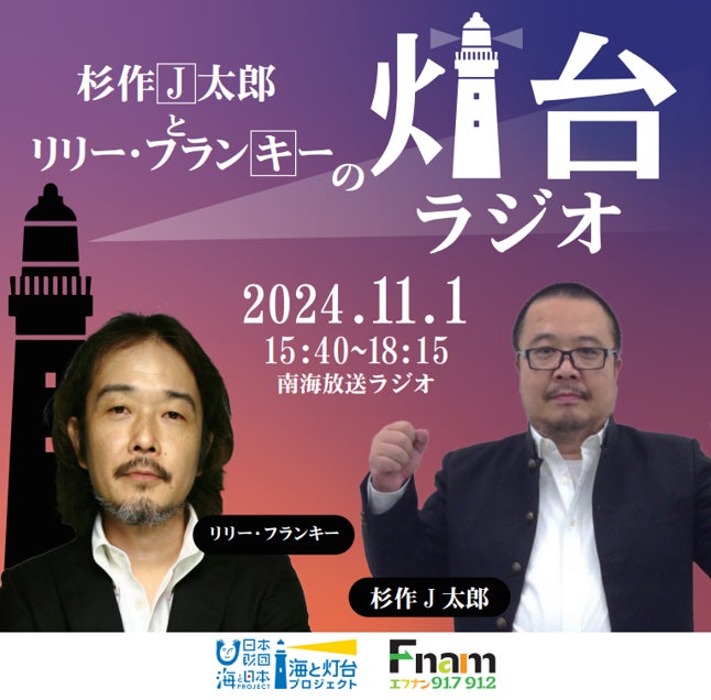 「灯台ラジオ」の提案から丸1年を経て、杉作J太郎さんが釣島灯台を訪ね、灯台からのラジオ生放送を実現させます。当日は、杉作J太郎さんのご友人でもあるリリー・フランキーさんをスペシャルゲストにお招きし、おふたりのユニークな視点で、釣島灯台の魅力をたっぷりとお伝えします。