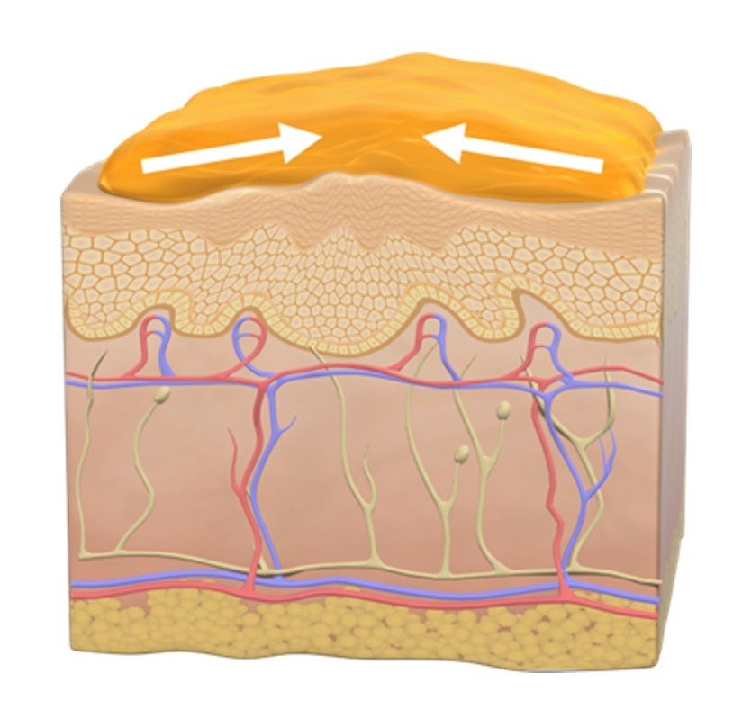 資生堂は、皮ふ上で柔軟性の高い収縮膜を形成する当社の「Second Skin」技術、および処方を進化させ、2週間連用することで目袋のボリュームを改善する新たな基剤を開発しました(図1)。また、収縮膜による微弱な圧縮刺激が皮ふ内部に働きかけることで、コラーゲンの産生と再構築が促進され、皮ふが受けた力に応じてより適した状態に導かれる可能性を見出しました。