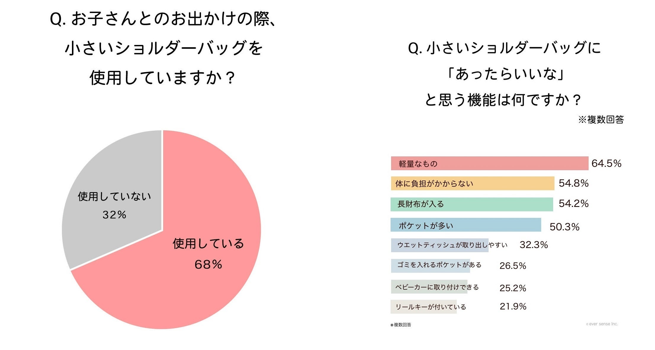 ninaru babyのママユーザーにアンケートを取った結果、お子さまとのお出かけの際に小さいショルダーバッグを持っているママが68%いることがわかりました。その中で、抱っこひもをしながらショルダーバッグを持つことが難しいという意見があり、抱っこひもと一緒に持てるショルダーバッグを作ることになりました。
