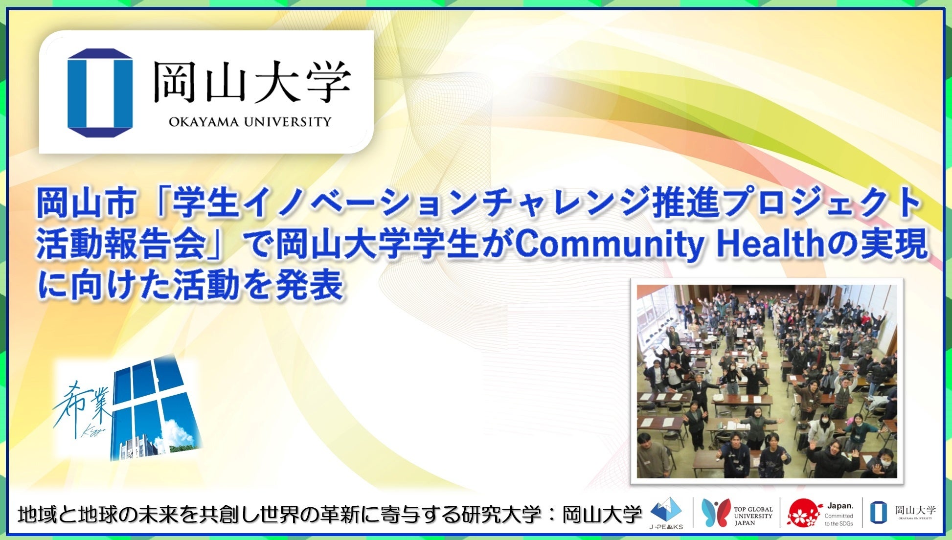 国立大学法人岡山大学(本部:岡山市北区、学長:那須保友)は、2025年2月22日に岡山市役所で開催された令和6年度「学生イノベーションチャレンジ推進プロジェクト」の活動報告会において、本学学生がCommunity Healthの実現に向けた活動について発表しました。