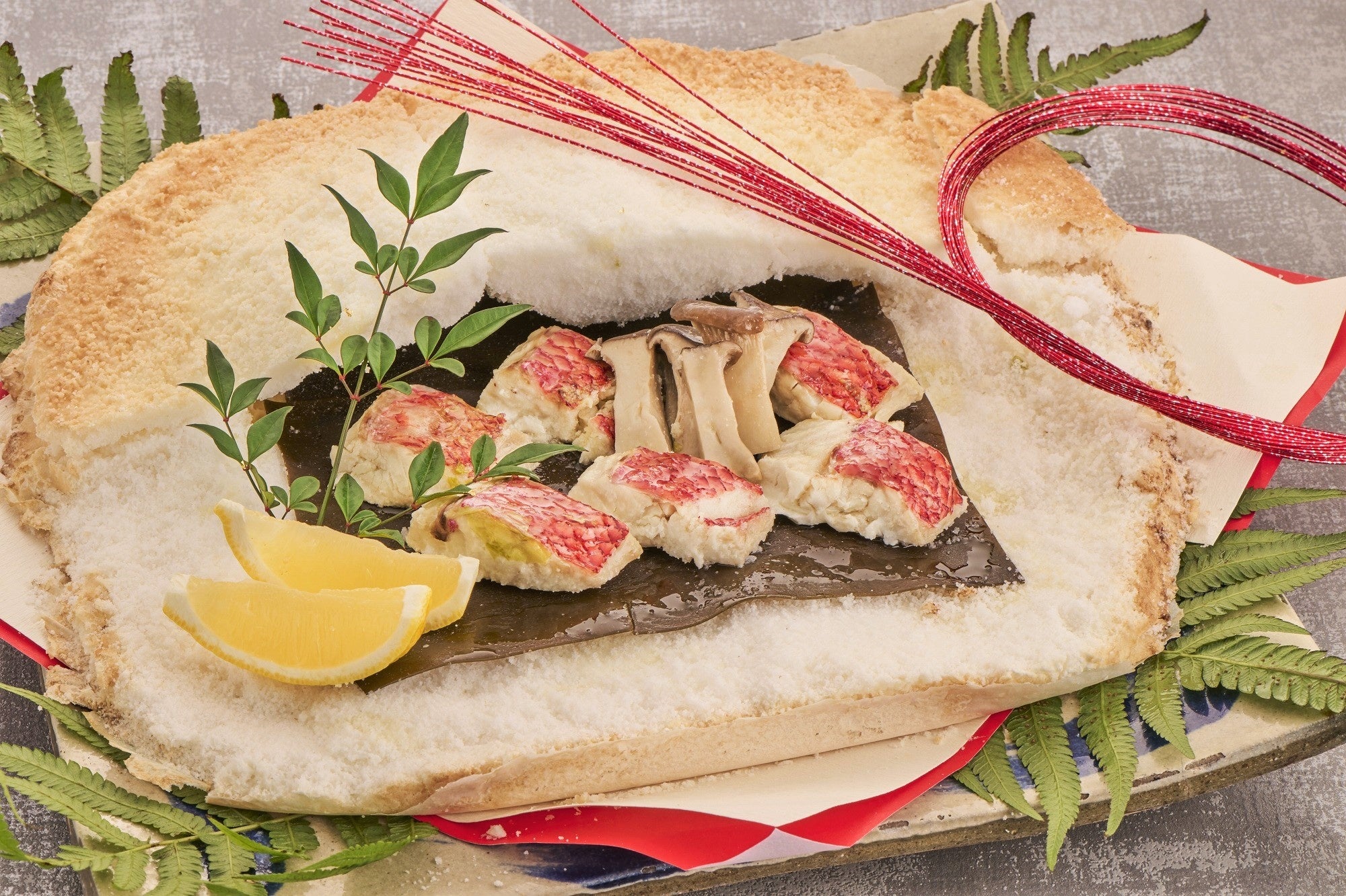 沖縄三大高級魚のひとつ「赤マチ(ハマダイ)」を塩釜焼きにしました。これからも「ともに助け合っていく」という意味を込め、お客様が共同で塩釜を割り開けて召し上がっていただきます。また、さんぴん茶の茶葉を入れて焼いているため、塩釜を割るとさんぴん茶の優しい香りが広がります。