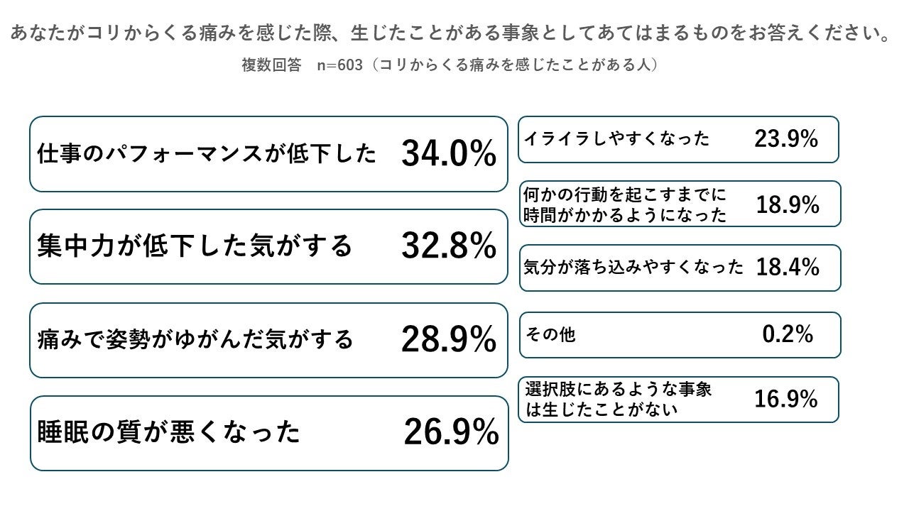 さらに、コリからくる痛みによってどのような事象が生じたか質問したところ、最も多かった回答は「仕事のパフォーマンスが低下した」で34.0%。次いで、「集中力が低下した気がする」で32.8%という結果となり、仕事や日常生活に悪影響を及ぼしている実態が明らかになりました。