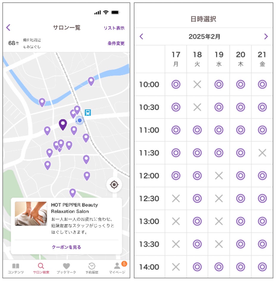 『ホットペッパービューティー』は、年間予約件数1億8388万件※1の国内最大級のヘアサロン・リラク&ビューティーサロンの検索・予約サービスです。多様な切り口の特集、行きたい日時での検索、ヘア・ネイルカタログ、口コミ、お得なクーポン、サロンスタッフなどから、自分の行きたいサロンを検索できます。ウェブサイト・アプリから24時間いつでも・どこでも予約でき、予約後に来店するとポイントが2%たまり、次回の利用時などに使えます。ジャンルは、ヘア、リラクゼーション、エステ、ネイル、アイビューティーまで幅広く提供しています。30分ごとの空き状況が確認できるため自分の予定に合わせた予約ができ、エリア検索機能で通いやすいサロンを見つけることができます。