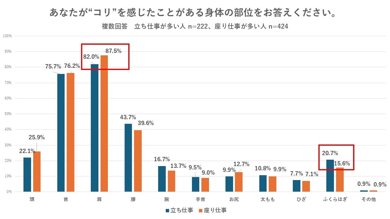 コリに関する傾向として、立ち・座り仕事など働き方による違いも調査しました。立ち仕事が多い人・座り仕事が多い人それぞれに、コリを感じたことがある身体の部位について聞くと、座り仕事は「肩」が立ち仕事より5.5ポイント高い結果となりました。一方で、立ち仕事は「ふくらはぎ」が座り仕事より5.1ポイント高い結果となりました。