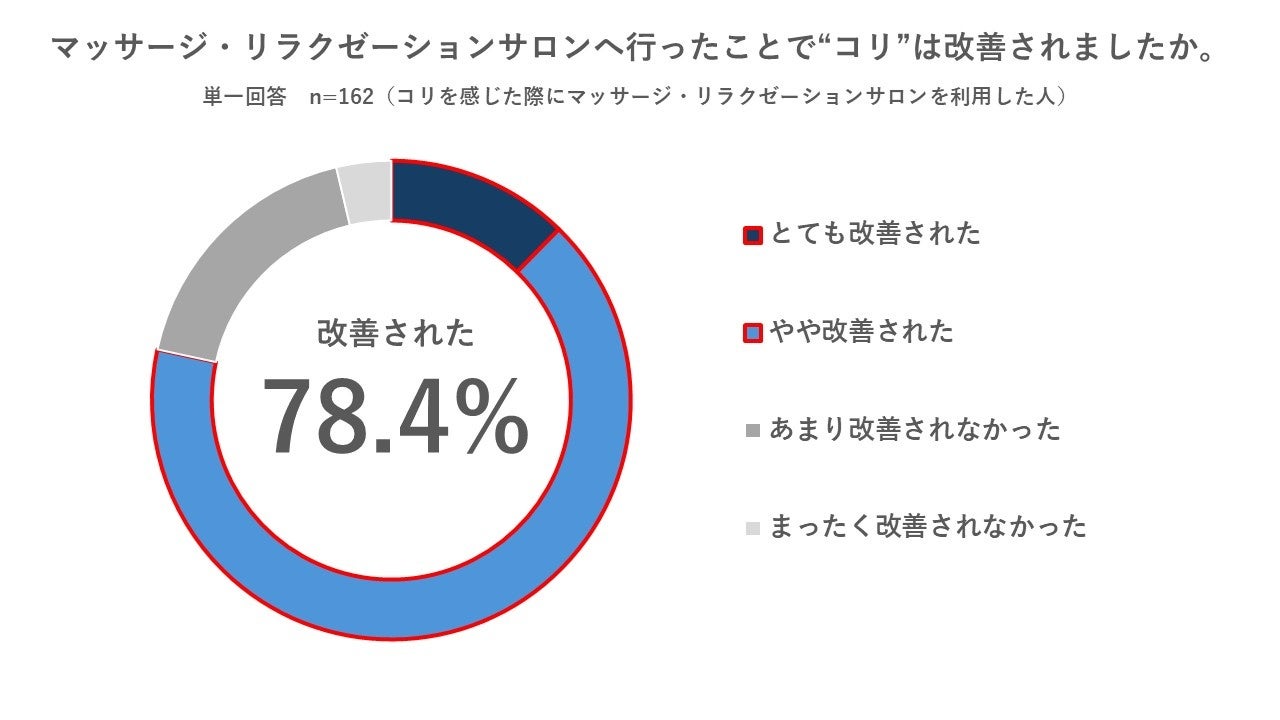 実際、コリを感じた際にマッサージ・リラクゼーションサロンを利用したことがある人にコリが改善されたかどうか聞いたところ、約8割の人が改善を実感していることが判明。コリの改善にプロの施術が有効であると感じている人が多数を占めていることが明らかになりました。