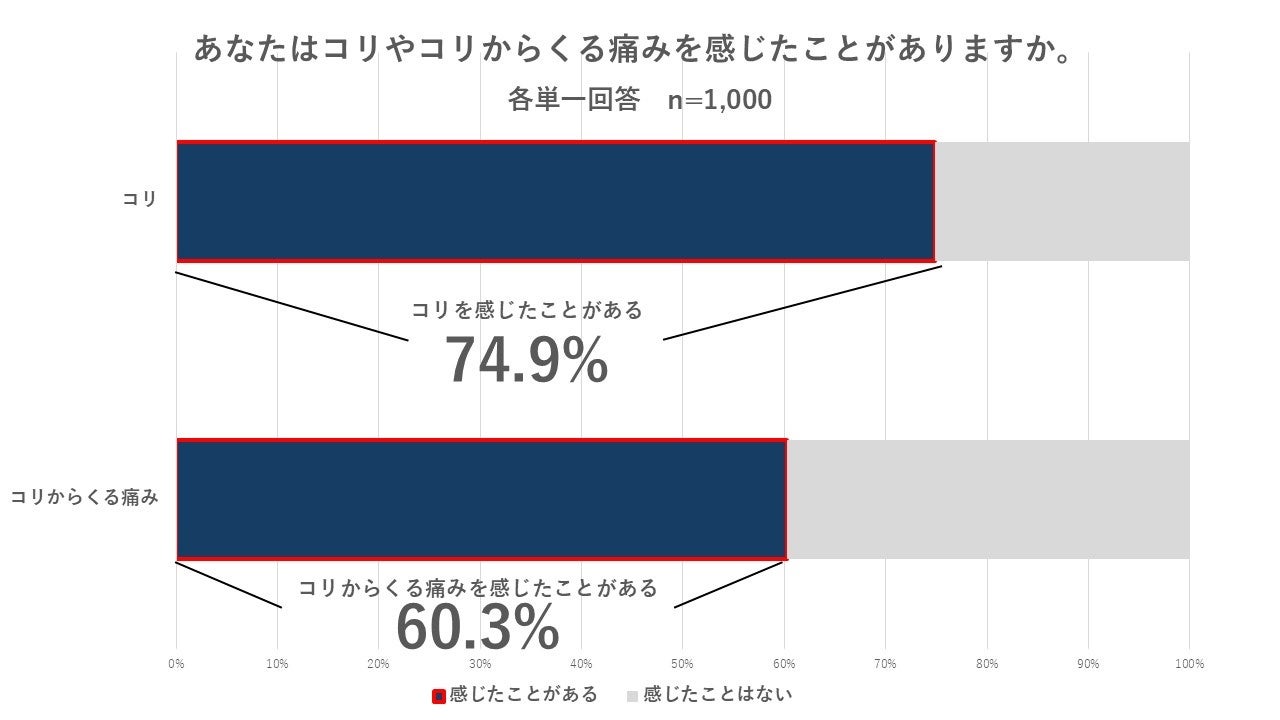 今回の調査では、働く人の74.9%が「身体のコリを感じたことがある」と回答。また、60.3%の人が「コリからくる痛みを感じたことがある」と回答しました。