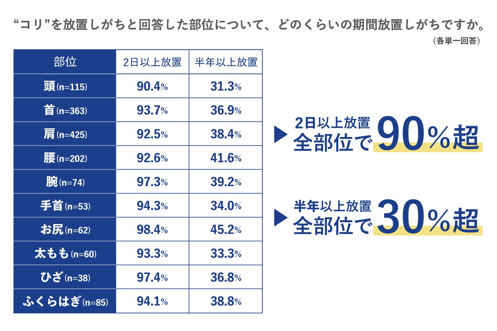 今回の調査で、身体のコリを放置しがちな人にその期間について伺うと、いずれの部位でも「2日以上」が9割超、「半年以上」も3割超となりました。コリを抱えていても対処せず長期間放置や我慢をしている人が一定数いる実態が明らかになりました。