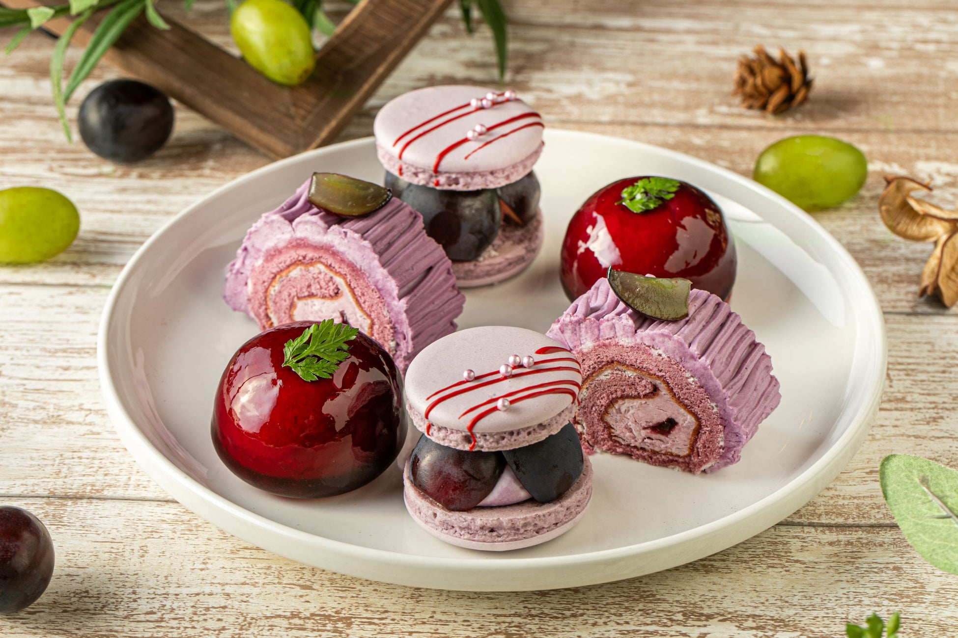 巨峰のモンブラン風ロールケーキ / 巨峰とヨーグルトのムース / 巨峰のマカロン