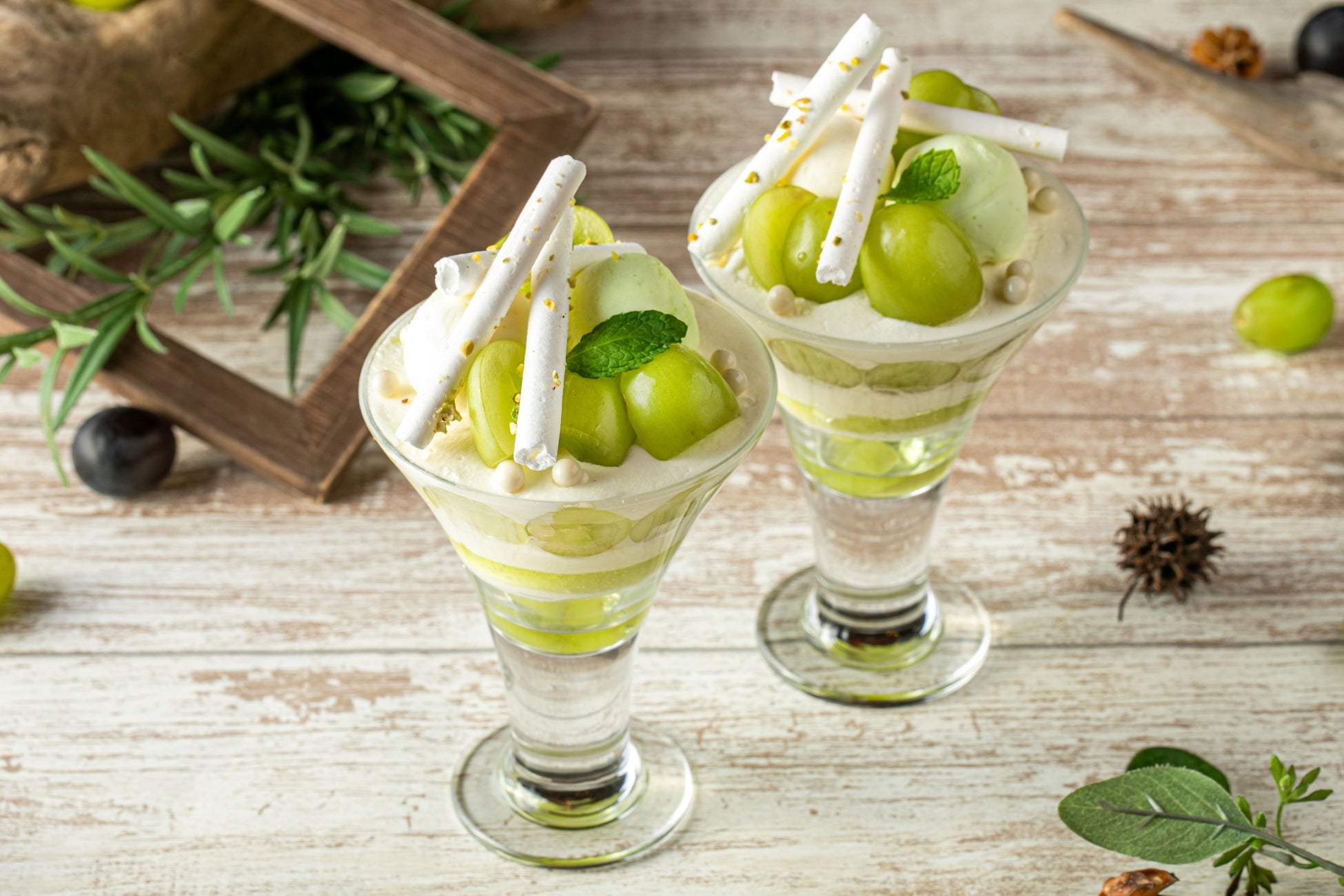 シャインマスカットのスペシャリテパフェをはじめ、巨峰とマスカットの豊かな風味を存分に楽しめる、スイーツ&セイボリー。