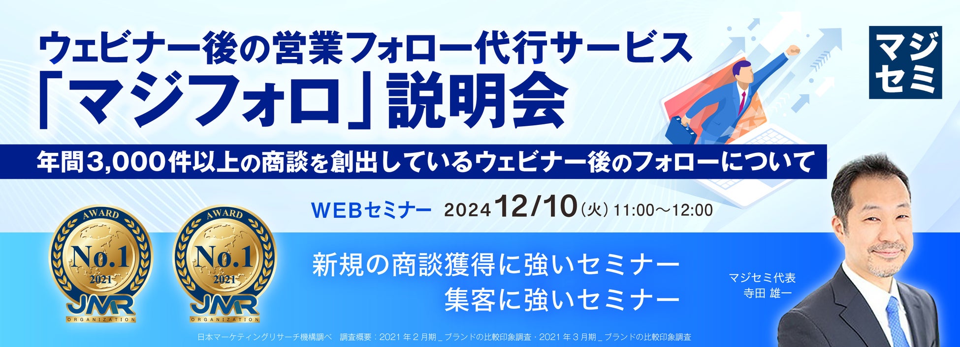 マジセミ株式会社は「ウェビナー後の営業フォロー代行サービス「マジフォロ」説明会」というテーマのウェビナーを開催します。