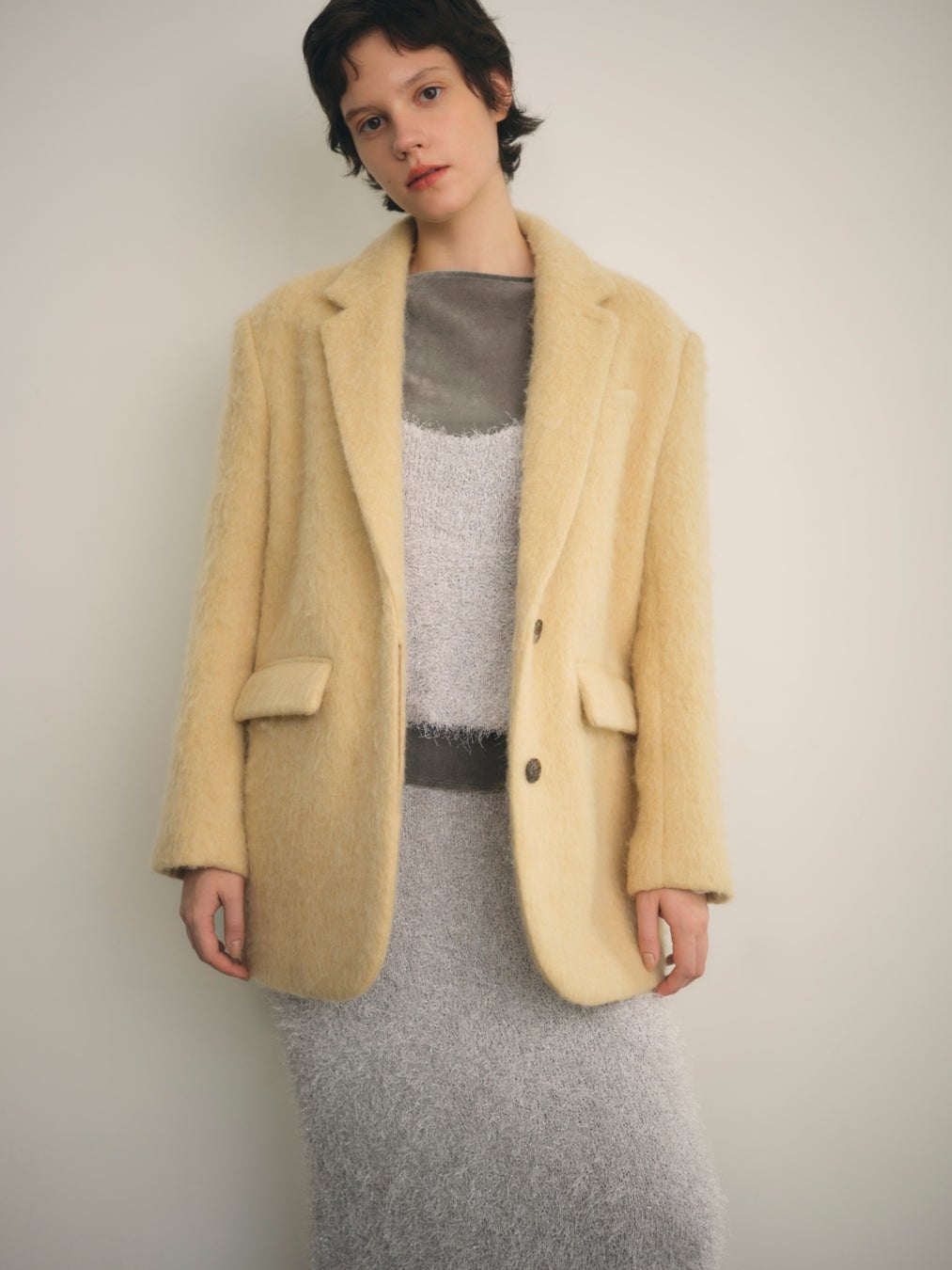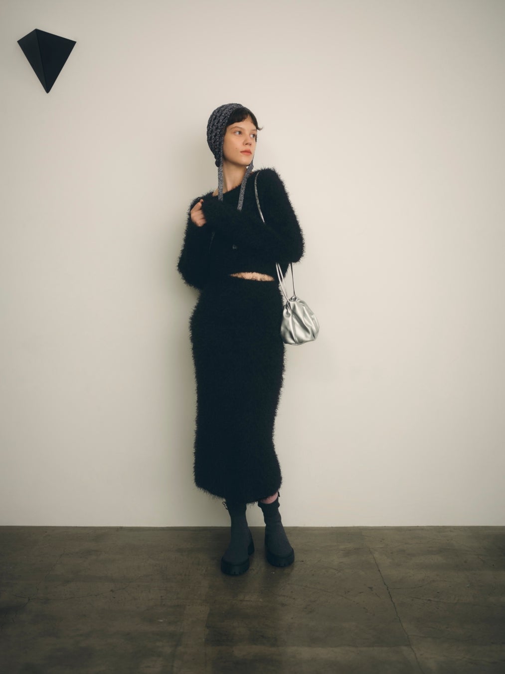 セットアップでも単品でも使いやすい、毛足の長いフリンジニットです。ホリデーシーズンにも映えるシルバーと、万能なブラックの2色展開。